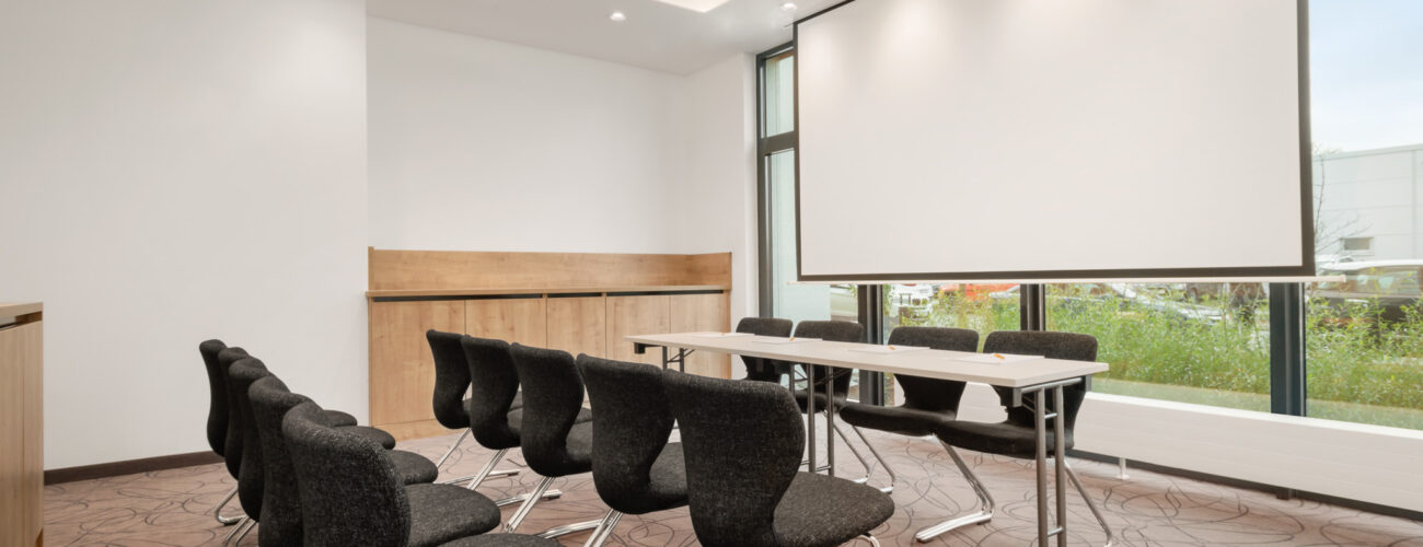 Der Tagungsraum 1 ist super flexibel. Kleine Meetings, Workshops und Seminare kannst Du hier in drei verschiedenen Sitzkonfigurationen abhalten. Ob bei Tageslicht oder verdunkelt – Du hast die Wahl. Und falls der Platz doch etwas knapp sein sollte, nimmst Du einfach noch Tagungsraum 2 dazu.